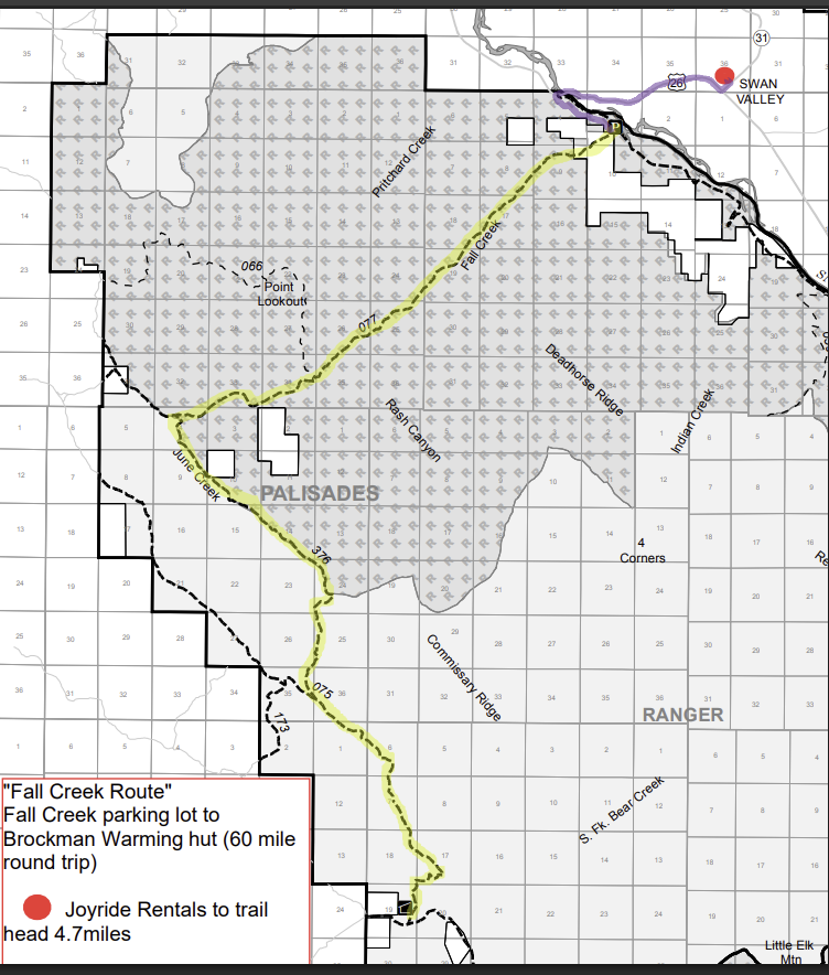 The Fall Creek Route is a groomed snowmobile trail that’s perfect for beginners and those looking for a relaxing ride. Starting at the Fall Creek parking lot, this scenic route covers a 60-mile round trip to the Brockman Warming Hut and back. The trail features mild terrain and offers beautiful views of the Tetons, making it an excellent choice for riders who want a comfortable and memorable adventure.