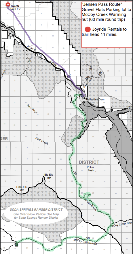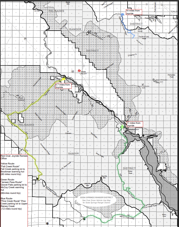 Joyride Rentals—your gateway to unforgettable snowmobiling adventures in the stunning Caribou-Targhee National Forest! We proudly hold Special Use Permits from the Forest Service, allowing us to deliver and pick up snowmobiles at all three of our signature routes: Jensen Pass, Fall Creek, and Pine Creek. Each of these route’s features professionally groomed trails and a range of terrain, making them perfect for every experience level—from beginners seeking a leisurely ride to seasoned snowmobilers craving a challenge. This convenient service means you won’t have to worry about hauling a trailer or spending time loading and unloading snowmobiles—just follow us to the trailhead and get straight to riding. Each drop-off location is a 15-minute drive or less from our office, ensuring you spend more time on the trail and less time on the road.