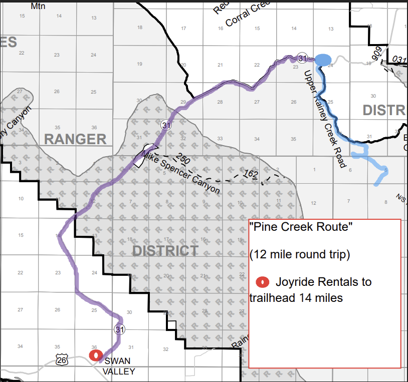 Pine Creek Route is a favorite among advanced riders thanks to its deep snow, challenging climbs, and breathtaking views of the Tetons. The surrounding area is best explored with mountain sleds, offering adrenaline-filled adventure and exceptional terrain. While the route does feature a 6-mile groomed trail ideal for trail sleds, the true appeal lies in the off-trail opportunities that cater to experienced snowmobilers.
